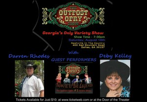 Please mark your calenders and join recording artist's Darren Rhodes and Deby Kelley on August 18th 2012, as they will be performing on The Outpost Opry Show in Dallas, Ga. 400 Red Mountain Road...