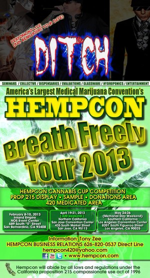 Ditch will perform this Saturday February 9th 2013 at the world’s largest Marijuana and Hemp expo; Hempcon. Ditch will take to the main stage at 8:00PM, following a performance by Jeffery Peterson aka The 420 Comic. Ditch will perform a recent new song called “Winning Alive” and other Ditch favorites for the freshly baked crowd. His set will also include Dj Noize and giveaways from Ny Kush Clothing, Splitarillos, Chronic Jerky and others. Ditch has recently teamed back up with Strap from Mansion Of Mayhem and will be releasing a new mixtape soon with Strap called “Return To The Mansion Of Mayhem”. He also just recently Underground Gold Volume II on I Tunes and will release the long awaited new full length album “O2BNLA” this year. Hempcon is the world’s largest industry trade show, showcasing many products for the hemp industry. The event will have speakers all weekend educating the crowd of over 30,000 people (throughout the weekend) on the laws and benefits of hemp. There will also be a Proposition 215 legal consumption area for those with a medicinal marijuana recommendation and government ID (prescription NOT required for event entry). Hempcon San Bernardino will take place this weekend, February 8,9, 10 2013 at Nos Events Center, with the special Ditch performance taking place at 8:00PM Saturday. Tickets are $20 and the event is 18 and over only. For more information and full list of vendors, speakers and more please visit www.hempcon.com . Ditch’s official website is www.lethaltendermusic.com . Fans can also meet Ditch in person at the Quality Genetix (www.qualitygenetix.com) booth located in the 215 area. Ditch promises those close to the front of the stage; “a wild ride and some free gear”.