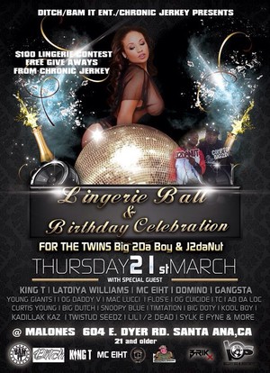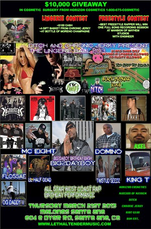 Ditch and Chronic Jerky maker of the world’s most flavorful beef jerky will hold their first annual lingerie ball at Malones Thursday March 21st 2013. The event will also be rapper Big2daboy’s official birthday bash featuring celebrity guests: King T, Mc Eight, Lil Half Dead, Domino Og Daddy V, Flossae, Twistud Seedz, Big2daboy, and others. The event will also feature live performances from Cloud 5, Kaustik, Ditch, Hazerd, Mansion Of Mayhem, Axel, Mr Dubie, Smoke Break Records and more. Ditch’s set will also feature a special guest performance by Strap. Horizon Cosmetics will giveaway $10,000 worth of Cosmetic Surgery at the event. The night will also feature at Lingerie Contest presented by Mansion Of Mayhem where the best dressed lingerie costume will win; $100 cash, a $100 gift basket, and other stuff. In addition the 2013 Lingerie Ball will feature a best freestyle rap competition where the winner will receive; a full studio session at Mansion Of Mayhem Studios for one full song recording and pressed. The event will also be showcasing some new products such as Chronic Jerky’s new flavors, Riot Gear Clothing, Horizon Cosmetics and others. Tickets are $10.00 and you can email Angie@lethaltendermusic.com for your advance tickets. Malones is located in Santa Ana, California off the 55 Freeway and Dyer road at: 604 E. Dyer Rd. This event is 21 and over only and parking is free. There will be clothing giveaways and prizes all night long. There will also be celebrity guest appearances. Ditch’s official website is www.lethaltendermusic.com and Chronic Jerky can be found at www.chronicjerky.com .
