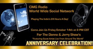 Hi there this is your fiend Jerry Cramer; Donna and I would like to invite you to join us for our special Donna & Jerry Show’s Anniversary Program. It is coming up on Friday October 14th at 8 pm CST and goes till midnight maybe longer. We invite you to visit our main radio website where you can find out all the information about us and the station. This show will be going out before a huge audience around the world. It will be live on CMG Radio and our 30 affiliate online stations as well as to our 25 FM stations here in the USA and to 250 radio stations by live feeds across the globe.